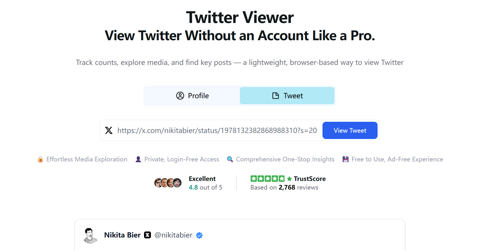 Instead of asking for a login, an API key, or any kind of session, Twitter-Viewer simply lets you paste a handle or a tweet URL and then loads the public content for you. From your perspective, you’re just visiting a regular website. From X’s perspective, there is no personal account to track, no profile to tag, and no user session to attach to a VPN warning.