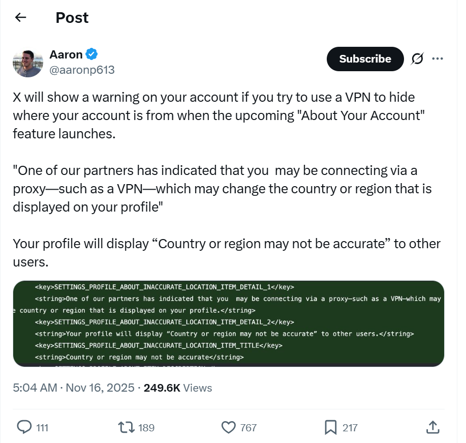In mid-November, MacRumors analyst Aaron Perris (@aaronp613) shared screenshots that appeared to come from an internal X experiment. In those images, a new “About this profile” section showed a warning that a profile’s “Country or region may not be accurate” when the system suspected the use of a VPN or proxy. A couple of days later, Social Media Today published one of the first news articles pulling this into a full story, suggesting that X was testing a feature that could indicate when an account appears to be hiding its true location via VPN.
